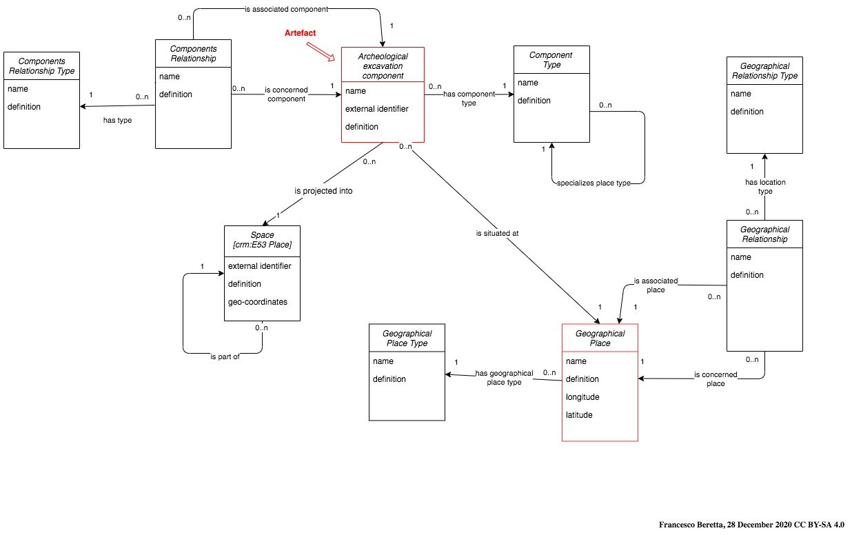 Chaque composante de la fouille est située par rapport aux autre composantes par la classe Components Relationship qui décrit la position relative des objets grâce à une typologie adéquate (par ex. couche supérieure pour une unité stratigraphique, ou se situant dans cette direction pour un mur par rapport à une couche, ou se trouvant dans la couche pour un objet lithique, etc). L’objet situé est associé par la propriété is concerned component tandis que l’objet par rapport auquel le précédent se situe est associé par la propriété is associated component. Les cardinalités 0,n : 1 indiquent que seulement deux objets peuvent être associés avec une relation.